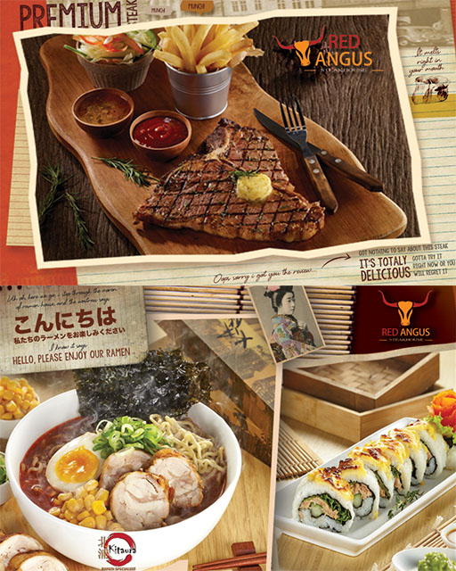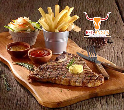 Red Angus Steakhouse kini hadir dengan berbagai menu makanan dan minuman. Menu yang disajikan seperti; Red Angus Promo Package, Red Angus Western Package, Red Angus Japanese Package. Steak yang disajikan menggunakan daging pilihan premium dengan tekstur daging yang juicy dengan citarasa yang khas.