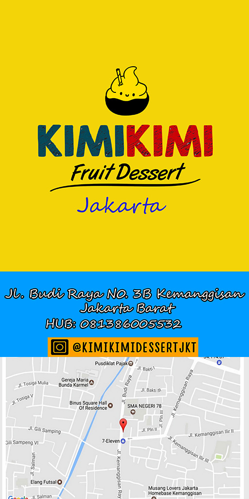 Kamu suka makanan manis alias dessert? Ada lokasi baru yang bisa jadi pilihanmu nih. KIMI KIMI Fruit Dessert adalah sebuah House of Dessert yang terletak di Jalan Budi Raya No.3B Kemanggisan - Jakarta Barat. Sesuai dengan namanya, KIMI KIMI Fruit Dessert menyajikan berbagai sajian yang memiliki citarasa manis. Aneka dessert yang disajikan memiliki tampilan menarik yang sangat menggiurkan untuk segera mencicipi. Berbagai menu dessert yang bisa kamu coba antara lain Sop Buah Banana Dragon, Mangga, Sirsak dan masih banyak menu manis lainnya.